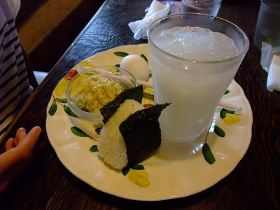 | これが基本のレギュラーモーニングのおにぎり。 この量でドリンク代のみとは太っ腹。 でももったいなくって普通の時間にお客様がこなくなっちゃうんじゃないだろうか。 |