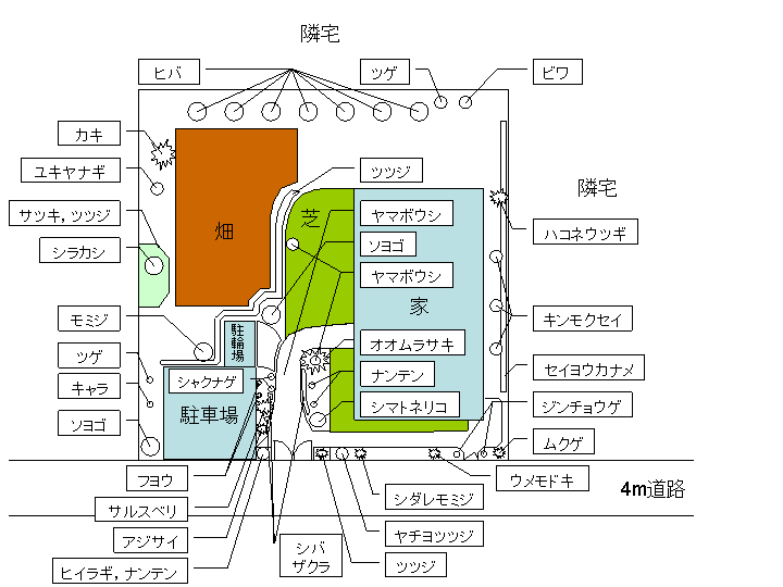 以下の図は自分でわかる範囲で現在(03.08.04)の庭に植えてある植栽を表したものです。