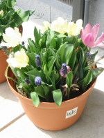 | マンションに住んでいた頃からチューリップは好きで育てていました。 隙間に生えているのはムスカリです。 |
