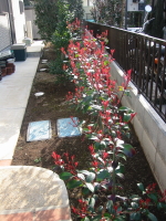 | 隣家との間には西洋カナメを植えてあります。 この時期は新芽が赤くてとてもきれいですね。 |