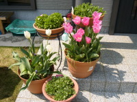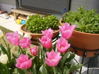 | 白いチューリップはもうおしまい。 fピンクは満開。 |