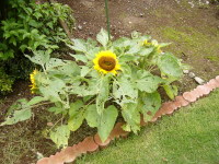 | ヒマワリです。 背があまり大きくならない種類ですがプランターに植えたものはいまいちでした。 直播(じかまき)が一番ですね。 |