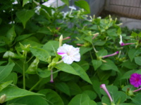 同じ株から白地にぴんくの筋が入った花とピンクの花が一緒に生えました。