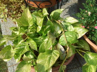 | 左はポトス。 10年くらい前に会社の人にもらって室内で育てていたのですがあまりにも成長が早くて疲れたのでこの夏に室外へ。 水が少なくなって色が薄くなってしまいましたが元気です。 寒さに意外に強いです。 枯れたら捨てるつもり。 |