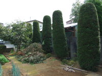 | 左から3番目のヒバが傾いてしまいました。 根元に大きな穴が開いているからです。 埋めようとしているのですが穴が大きすぎてどうにもならず。 もしかしたら耐え切れずに倒れるかも。 |