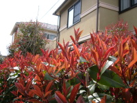 | 暖かくなって西洋カナメがだいぶ伸びました。新芽だけ赤くなるんですよね。 | |